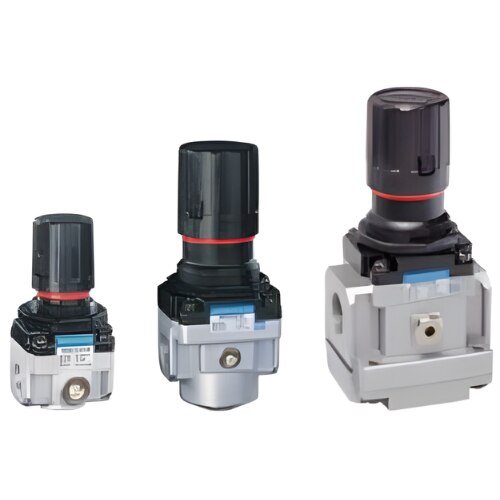 Sizes: G1/4, G3/8, G1/2, G3/4, G1 - Regulator Conform to ISO 6953 - 1 Suitable for panel and modular mountings Non raising Press to Lock adjusting knob for locking at any set pressure Diaphragm operated, relieving type Pressure compensated by balanced poppet Flow compensated in models R14, R15 and R17 (with venturi) for faster response Good flow and regulating characteristics - Regulator with NRV Conform to ISO 6953 - 1 Suitable for panel and modular mountings Non raising Press to Lock adjusting knob for locking at any set pressure Diaphragm operated, relieving type Pressure compensated by balanced poppet Flow compensated in models R14 and R15 (with venturi) for faster response Good flow and regulating characteristics Built in non return valve allows free air flow in reverse direction. When the inlet air is reduced by and below the setup pressure